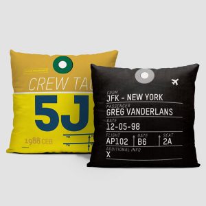 Throw pillow inspired on vintage luggage tags with airport codes on it.